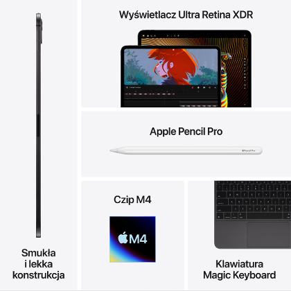 iPad Pro 11" M4 współpracuje z Apple Pencil i klawiaturą Magic Keyboard, przekształcając tablet w pełnoprawne narzędzie pracy. Rysik oferuje pikselową precyzję, minimalne opóźnienie i czułość na nacisk, co czyni go idealnym do rysowania i notowania. Magic Keyboard z pełnowymiarowymi klawiszami i gładzikiem zapewnia wygodę jak w laptopie. To mobilne studio, które zmieścisz w torbie – idealne dla kreatywnych profesjonalistów, studentów i wszystkich, którzy chcą pracować bez kompromisów.