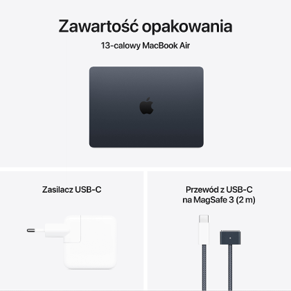 | Inne | Zawartość zestawu | 13-calowy MacBook Air, zasilacz USB, przewód USB-C na MagSafe 3 (2m) |