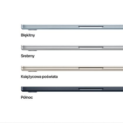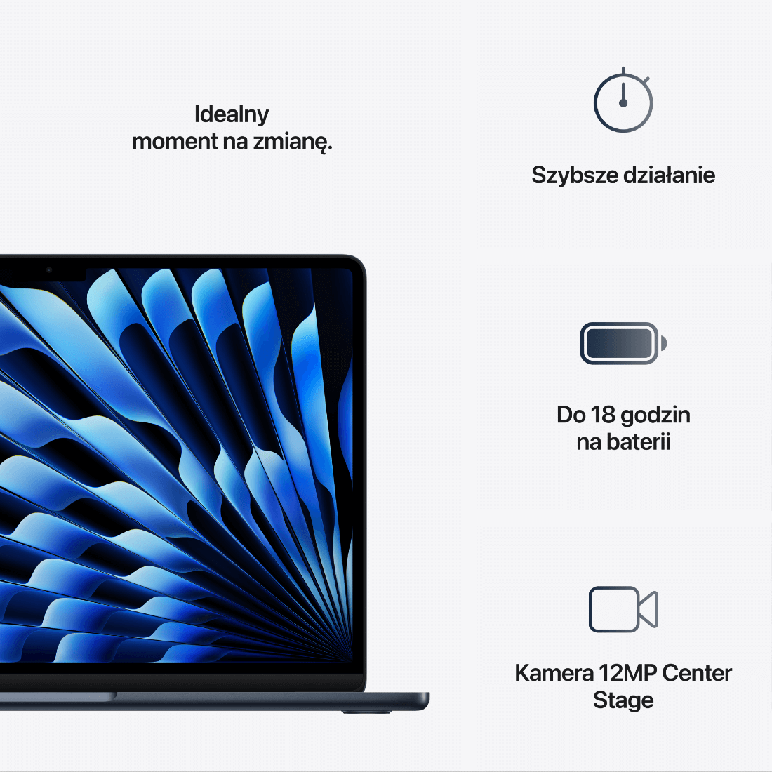 Wyświetlacz Liquid Retina o przekątnej 13,6 cala oferuje wysoką rozdzielczość 2560 x 1664 pikseli oraz szeroką gamę kolorów (P3). Technologia True Tone automatycznie dostosowuje balans bieli do otoczenia, co podnosi komfort pracy. Jasność matrycy na poziomie 500 nitów sprawia, że obraz pozostaje czytelny nawet w jasnym otoczeniu. Dzięki kamerze 12MP Center Stage, trzem mikrofonom i czterem głośnikom z dźwiękiem przestrzennym Dolby Atmos, wszystko wygląda i brzmi fantastycznie. MacBook Air posiada również gniazdo audio mini-jack 3,5 mm.