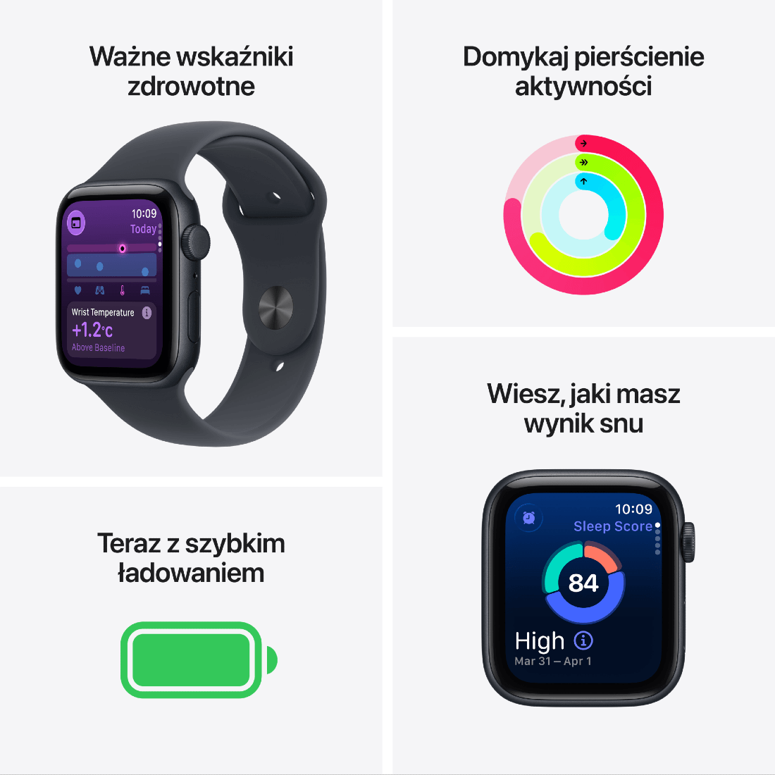Zegarek oferuje szeroką gamę trybów treningowych, w tym bieganie, jazdę na rowerze i pływanie. Dzięki GPS i integracji z iPhonem możesz śledzić postępy w czasie rzeczywistym. Apple Watch SE 3 umożliwia wysyłanie wiadomości, odbieranie połączeń i słuchanie muzyki bezpośrednio z nadgarstka. Wersja GPS + Cellular zapewnia pełną łączność nawet bez iPhone’a. Do tego szeroki wybór pasków i tarcz pozwala dopasować zegarek do Twojego stylu.