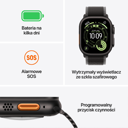 Ultra 3 ma największy i najjaśniejszy ekran w historii Apple Watch, który pozostaje czytelny nawet w ostrym słońcu. Może pełnić funkcję latarki, a jego jasność i kąt widzenia zapewniają komfort w każdych warunkach. Zegarek oferuje baterię na kilka dni – do 42 godzin standardowego użytkowania i nawet 72 godziny w trybie niskiego zużycia energii. To idealny wybór dla osób, które potrzebują niezawodnego sprzętu w podróży, na treningu i w codziennym życiu.