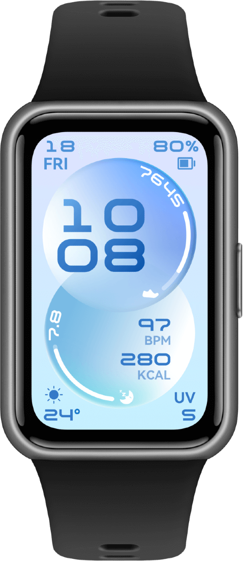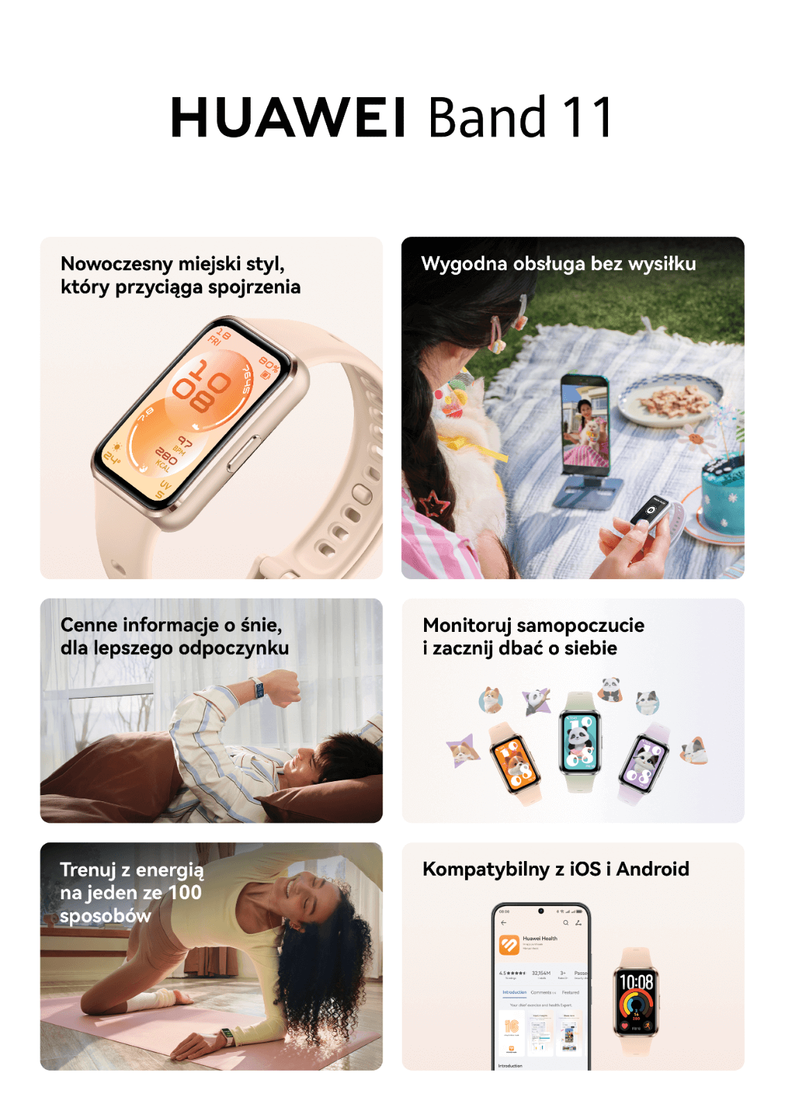 pomiar tętna, SpO₂, HRV, oddychania, analiza snu i regeneracji, ponad 100 trybów sportowych (również dla osób na wózkach), redukcja stresu i „animowany nastrój” wspierający dobre samopoczucie