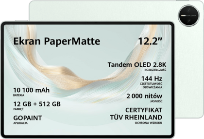 Zobacz więcej i pracuj wygodniej dzięki 12,2-calowemu ekranowi Tandem OLED PaperMatte o rozdzielczości 2.8K i jasności do 2000 nitów. Matowa powierzchnia eliminuje aż 99% refleksów, co pozwala korzystać z tabletu nawet w pełnym słońcu. Odwzorowanie 1,07 mld kolorów, częstotliwość 144 Hz i certyfikaty ochrony wzroku (TÜV Rheinland, SGS) sprawiają, że obraz jest nie tylko realistyczny, ale też bezpieczny dla oczu. Tryb eBook i redukcja niebieskiego światła zapewniają komfort nawet podczas długiej pracy lub czytania.
