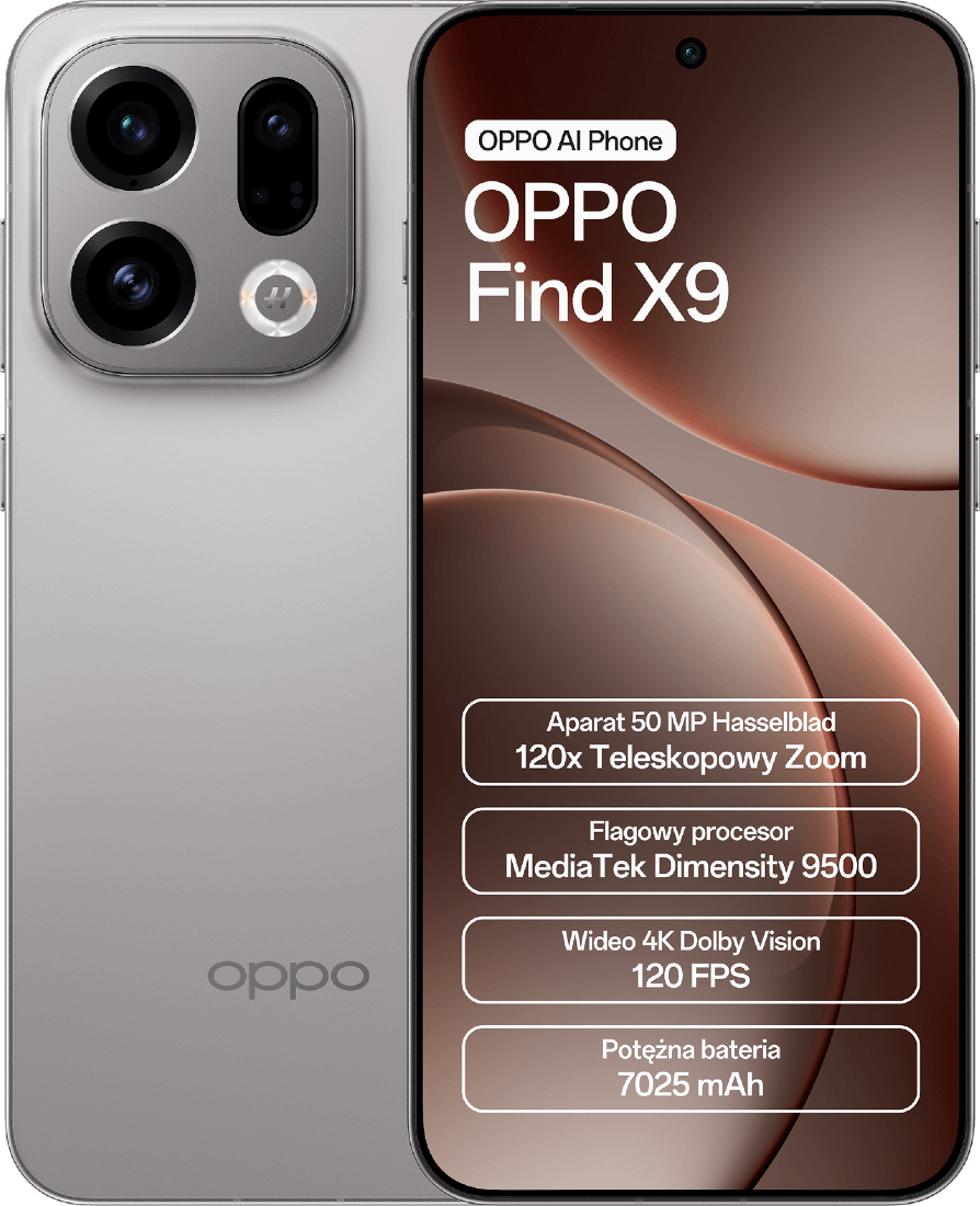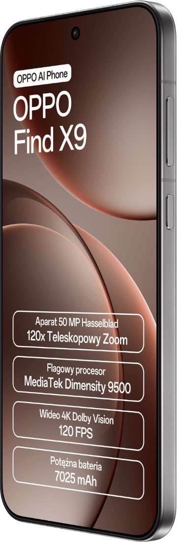 Z OPPO Find X9 nie musisz martwić się o energię – bateria 7025 mAh zapewnia do 54 godzin rozmów i ponad 750 godzin czuwania. Szybkie ładowanie SUPERVOOC 80 W oraz bezprzewodowe AIRVOOC 50 W pozwalają błyskawicznie uzupełnić energię. Procesor MediaTek Dimensity 9500 (3 nm) i GPU Mali Drage MC12 gwarantują płynność działania, a 12 GB RAM i 512 GB pamięci wewnętrznej umożliwiają multitasking bez kompromisów. OPPO Find X9 obsługuje 5G, Dual SIM, NFC, Wi-Fi 7 i Bluetooth 6.0 – to smartfon gotowy na każdą sytuację.