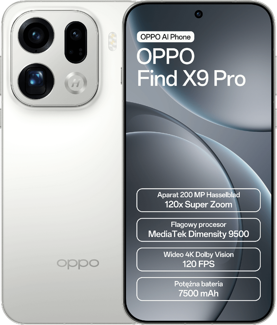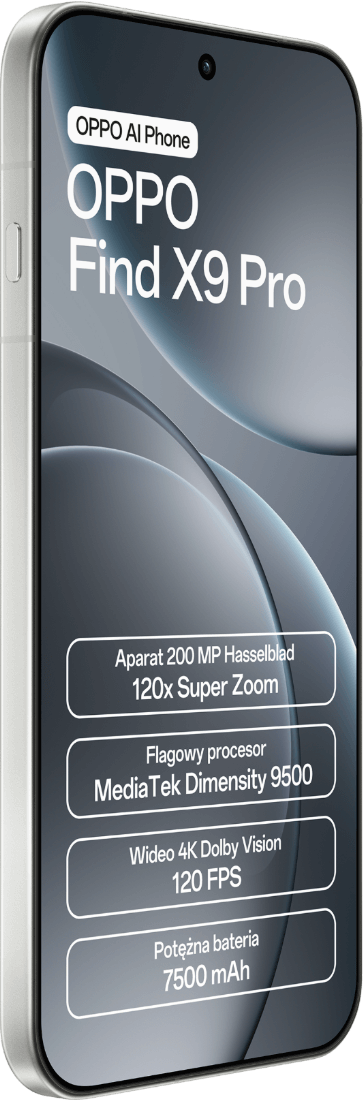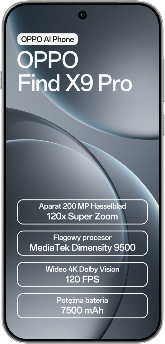OPPO Find X9 Pro to moc zamknięta w eleganckiej obudowie. Bateria 7500 mAh zapewnia do 47 godzin rozmów, a szybkie ładowanie SUPERVOOC 80 W i bezprzewodowe AIRVOOC 50 W pozwalają błyskawicznie uzupełnić energię. Procesor MediaTek Dimensity 9500 (3 nm), 16 GB RAM i 512 GB pamięci wewnętrznej gwarantują płynność działania nawet przy najbardziej wymagających zadaniach. Funkcje AI LinkBoost 3.0, AI BeaconLink i AI Studio optymalizują łączność, przetwarzanie obrazu i zarządzanie energią. OPPO Find X9 Pro obsługuje 5G, Wi-Fi 7, Bluetooth 6.0 i posiada certyfikat IP69 – to smartfon gotowy na wszystko.