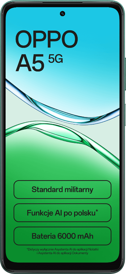 Zachwyć się matowym wykończeniem z pryzmatyczną fakturą, które mieni się niczym zorza polarna przy każdym ruchu. OPPO A5 5G dostępny jest w dwóch eleganckich kolorach – biały inspirowany chmurami i zielony, który hipnotyzuje grą światła. Smukła obudowa nie tylko świetnie wygląda, ale też doskonale leży w dłoni. To smartfon, który łączy design premium z codzienną funkcjonalnością.