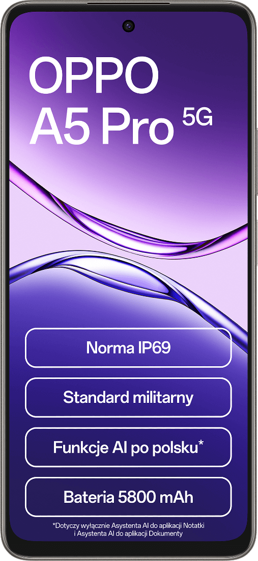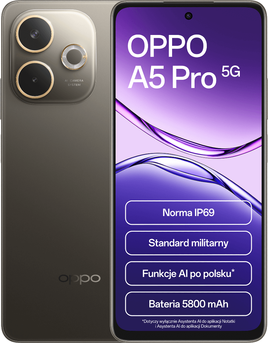 OPPO A5 Pro 5G to smartfon stworzony z myślą o użytkownikach, którzy oczekują niezawodności i elegancji. Smukła obudowa (7,76 mm) z wykończeniem inspirowanym naturą dostępna jest w kolorze oliwkowym i czekoladowym, a przyjemna w dotyku faktura skóry wegańskiej dodaje mu klasy. Wyświetlacz IPS 6,67" o jasności 1000 nitów i odświeżaniu 120 Hz zapewnia doskonałą widoczność i płynność obrazu nawet w pełnym słońcu. Certyfikat IP68/IP69 i odporność klasy militarnej gwarantują trwałość w każdych warunkach.