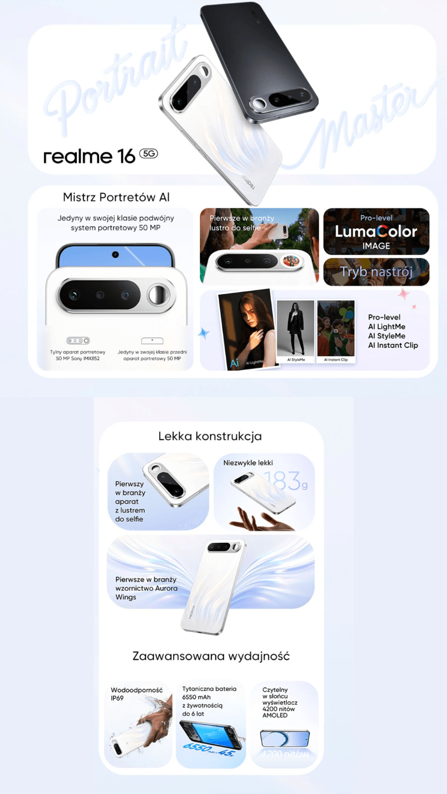 naturalne kolory dzięki LumaColor Image, przednia kamera 50 MP oraz selfie wykonywane głównym aparatem; kreatywne tryby AI (StyleMe, LightMe, Idealne Zdjęcie, Popout, Kolaż) pozwalają tworzyć profesjonalne ujęcia