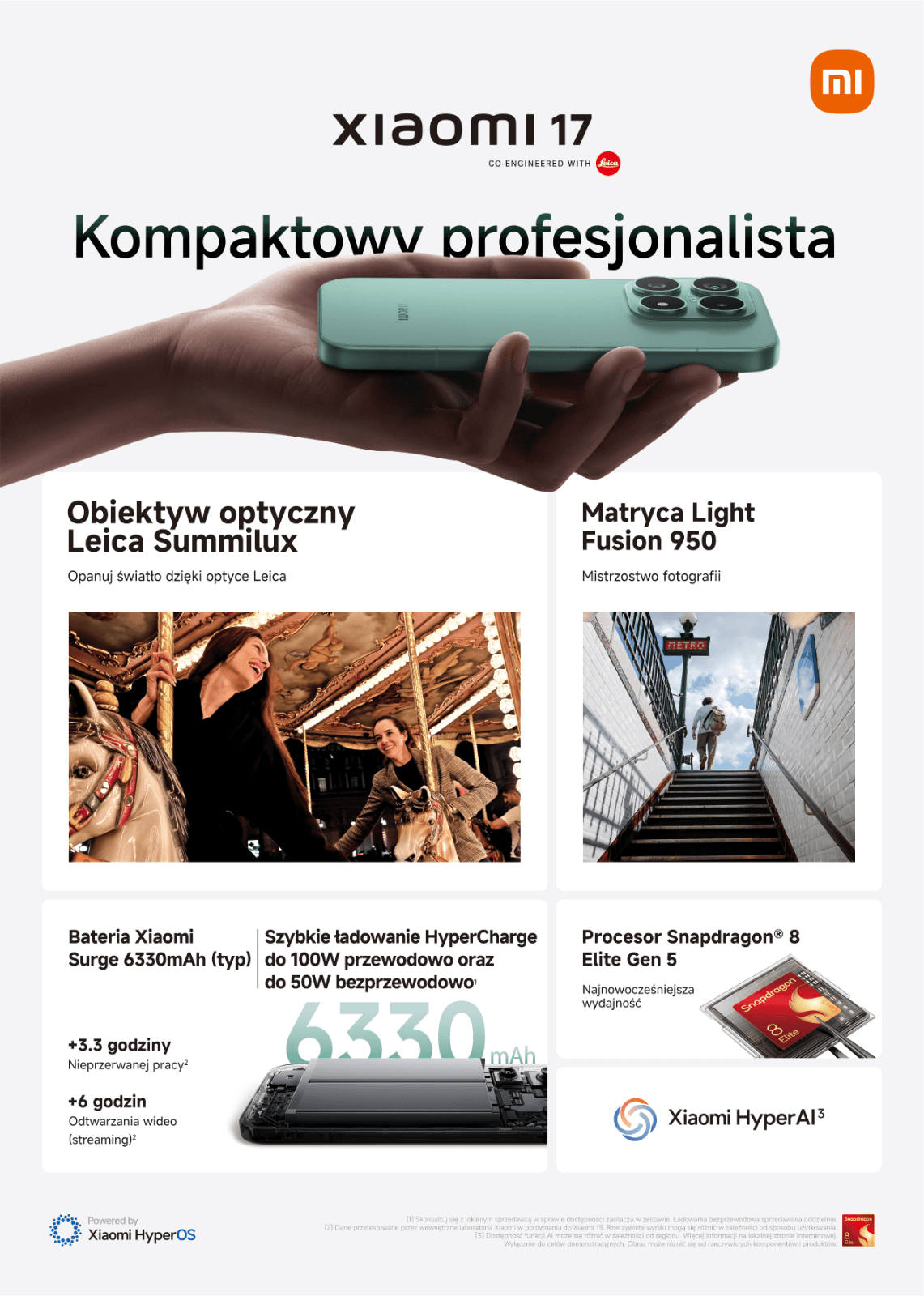 Smartfon Xiaomi 17 oferuje akumulator 6300 mAh, który zapewnia długą pracę na jednym ładowaniu — nawet podczas intensywnego korzystania z aplikacji i multimediów. Technologia HyperCharge 100 W pozwala błyskawicznie uzupełnić energię, a ładowanie bezprzewodowe dodatkowo zwiększa wygodę użytkowania.