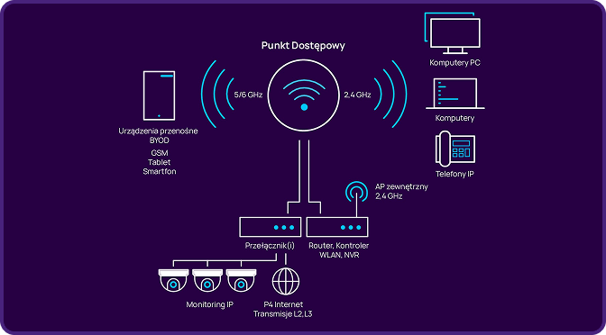 Instalacja sprzętu (punkty dostępowe, kontrolery, przełączniki), konfiguracja sieci (SSID, VLAN, QoS) oraz integracja z istniejącą infrastrukturą IT.