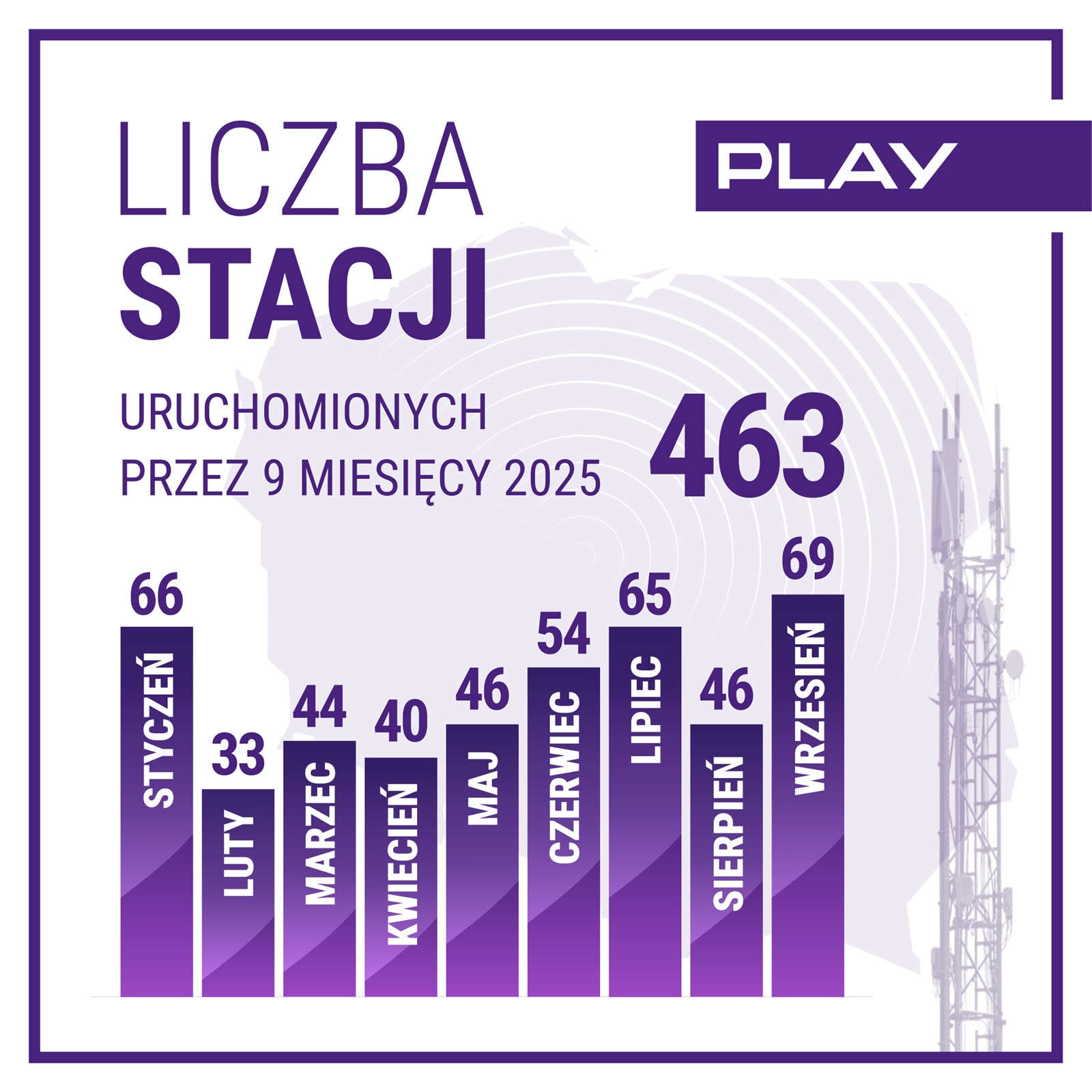 Na koniec września liczba stacji bazowych telefonii mobilnej w sieci Play wynosiła 12 889. Od początku roku uruchomiliśmy 463 stacje.